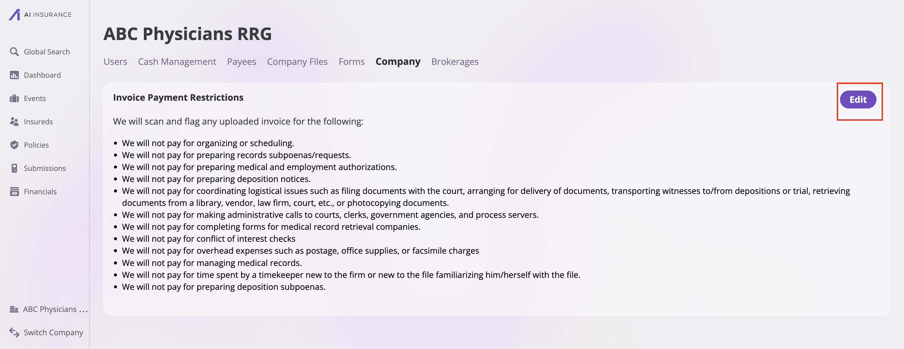 Follow these steps to get started with the Invoice Audit service:- Go to your company settings by clicking your company name in the sidebar and selecting the Company tab.