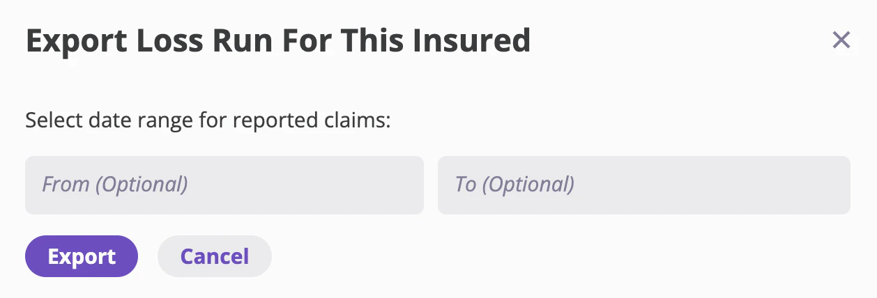 The “Export Loss Run For This Insured” modal will open with the following options:- Select date range for reported claims: