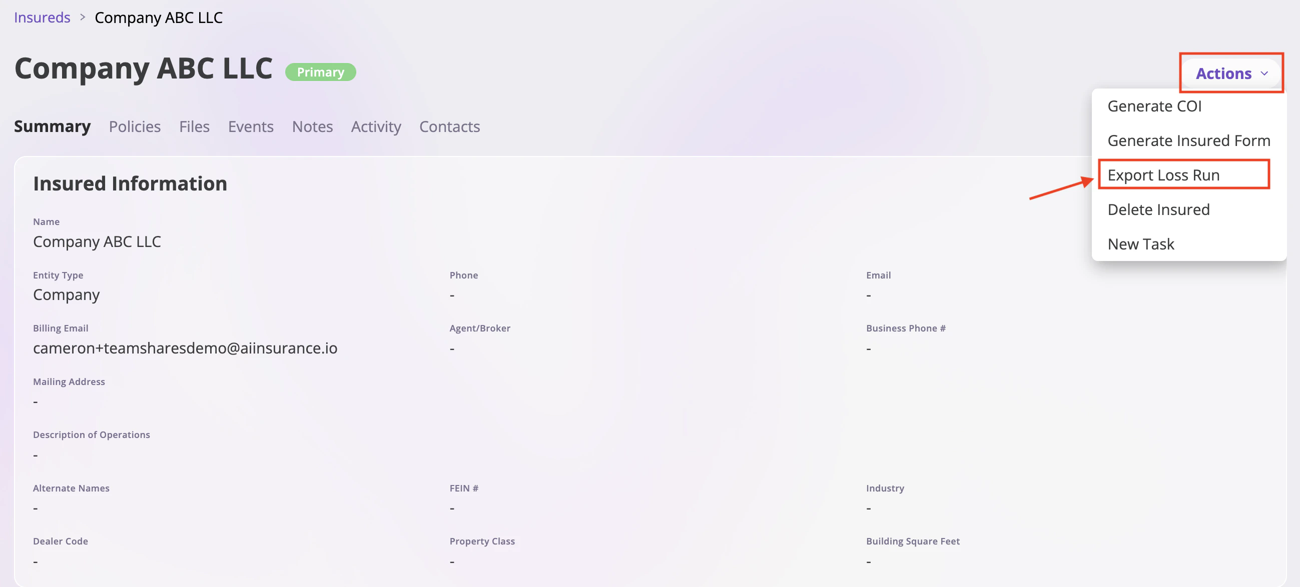 - Once you’ve selected the insured, look for the Actions dropdown menu