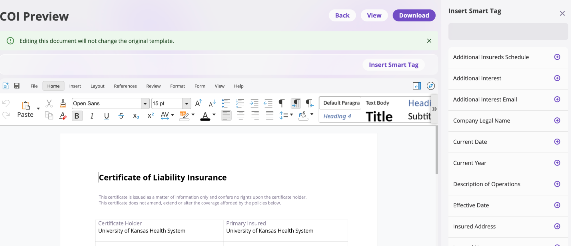 - Certificate of Insurance (COI): A document that serves as proof of insurance coverage. It provides essential details about the insured’s policy, such as the type of coverage, policy limits, effective dates, and the insurer’s information.