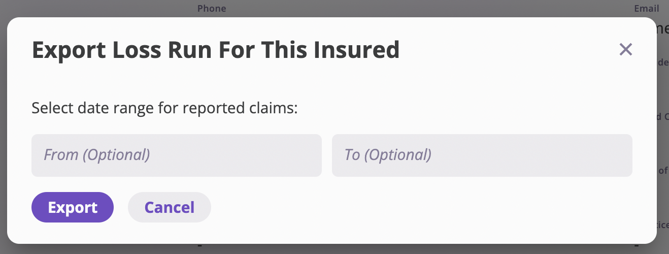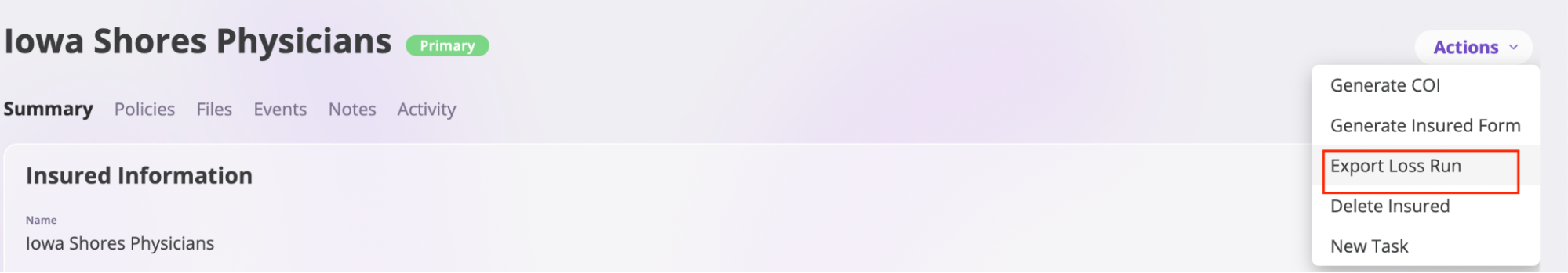 - Open the Actions dropdown and choose the Export Loss Run option. This will open the Export Loss Run for This Insured form modal.