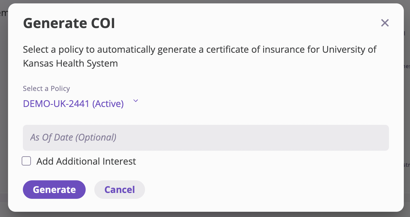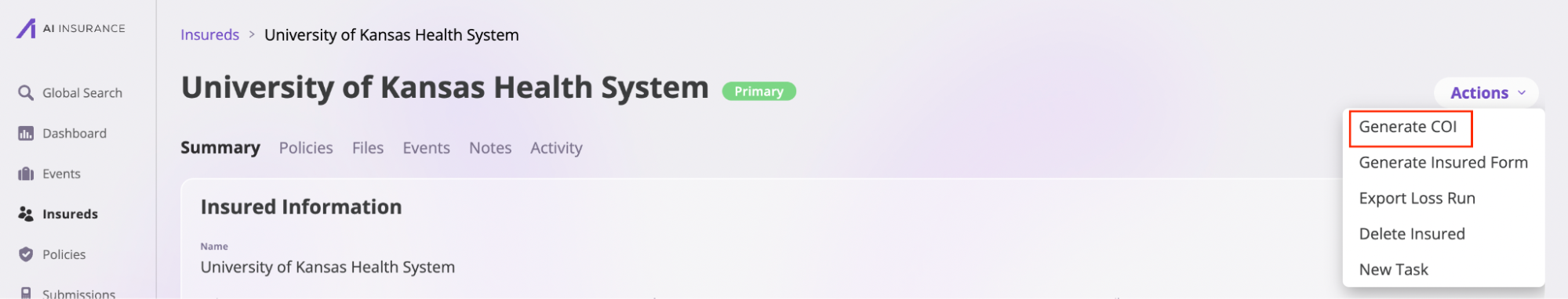 - Go to the Actions dropdown and select the Generate COI option. This action opens up a Generate COI modal.
