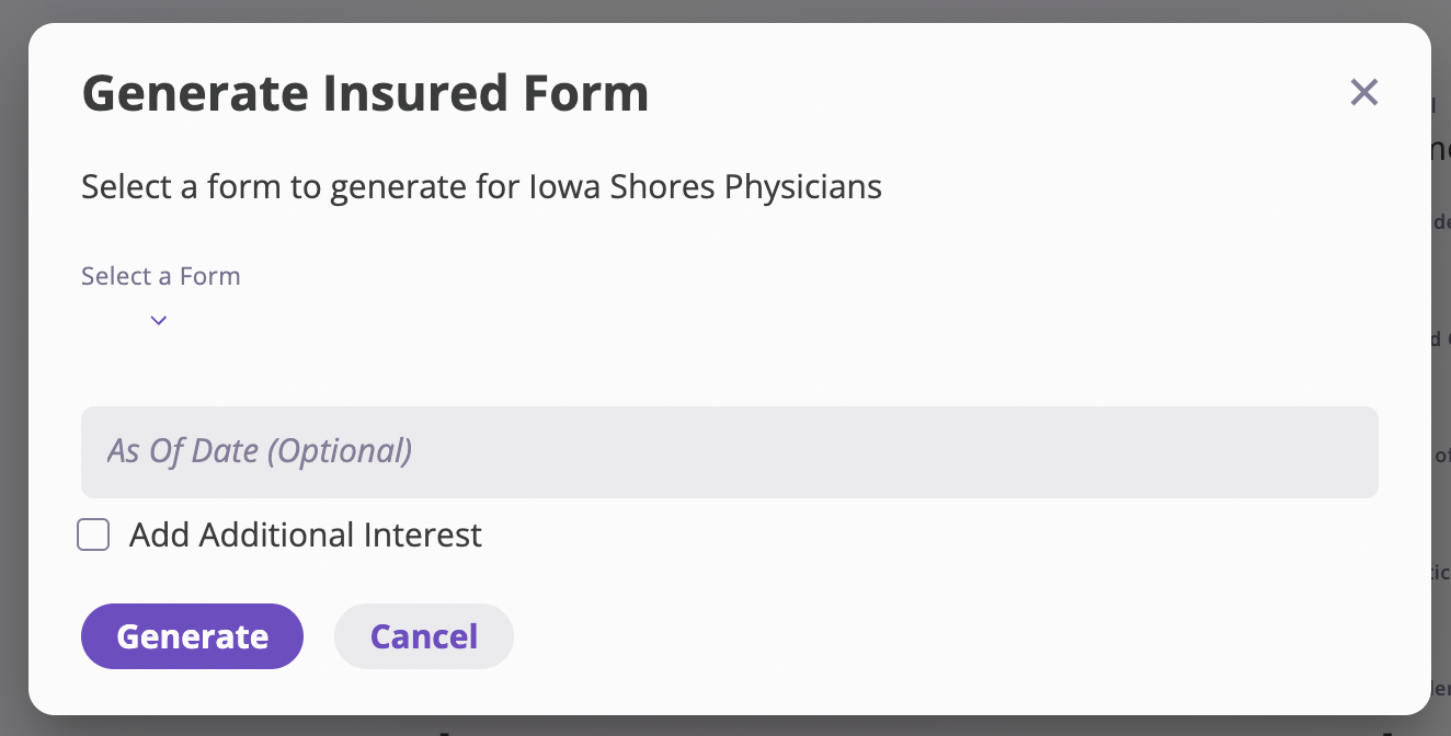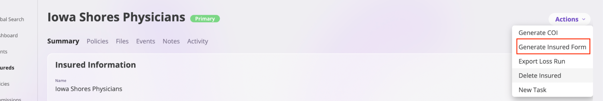 - Open the Actions dropdown and choose Generate Insured Form. This will open the Generate Insured Form modal.