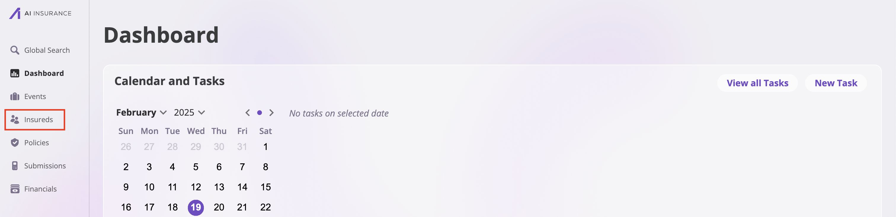 To generate an Insured forms, take the following steps:- Navigate to the Insureds page by clicking the Insureds tab.