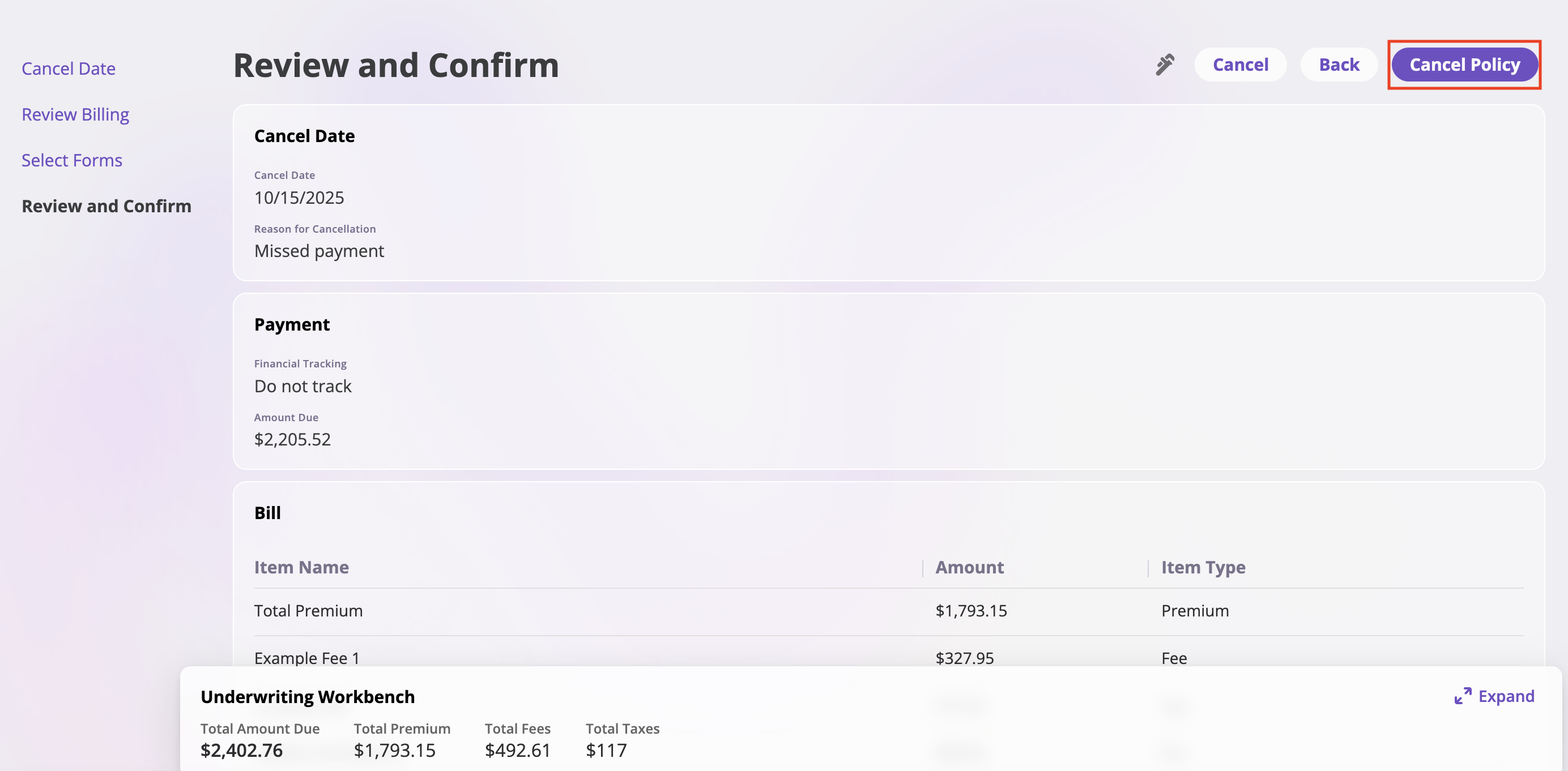 - The “Bill” section provides a detailed breakdown of the “Total Premium” and any “Example Fee,” showing the “Old Value,” “Change in Value,” and “New Value.”