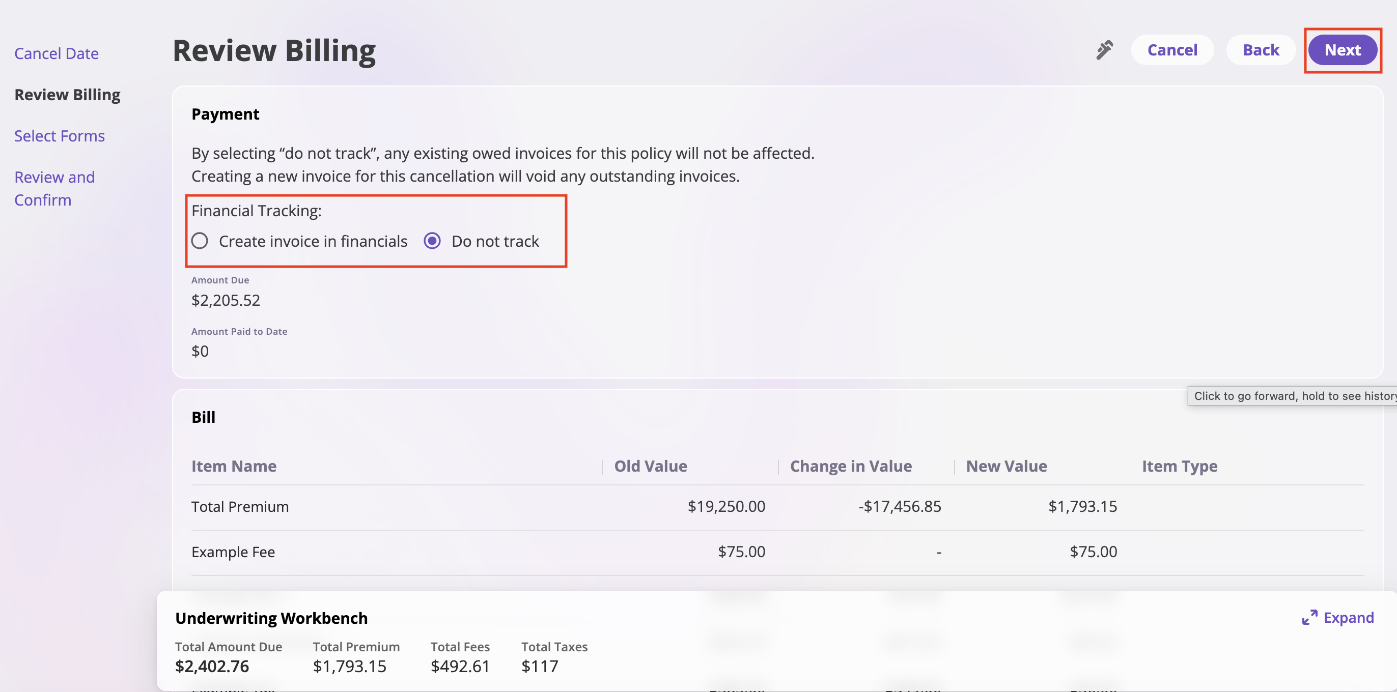 This page displays the financial impact of the cancellation and allows you to choose how to track the billing.-